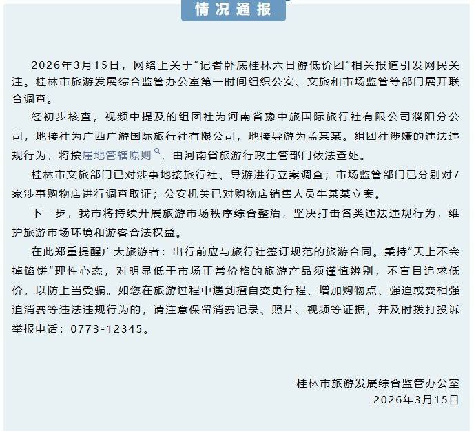 3月15日,网络上关于“记者卧底桂林六日游低价团”相关报道引发网民关注。桂林市旅游发展综合监管办公室第一时间组织公安、文旅和市场监管等部门展开联合调查。