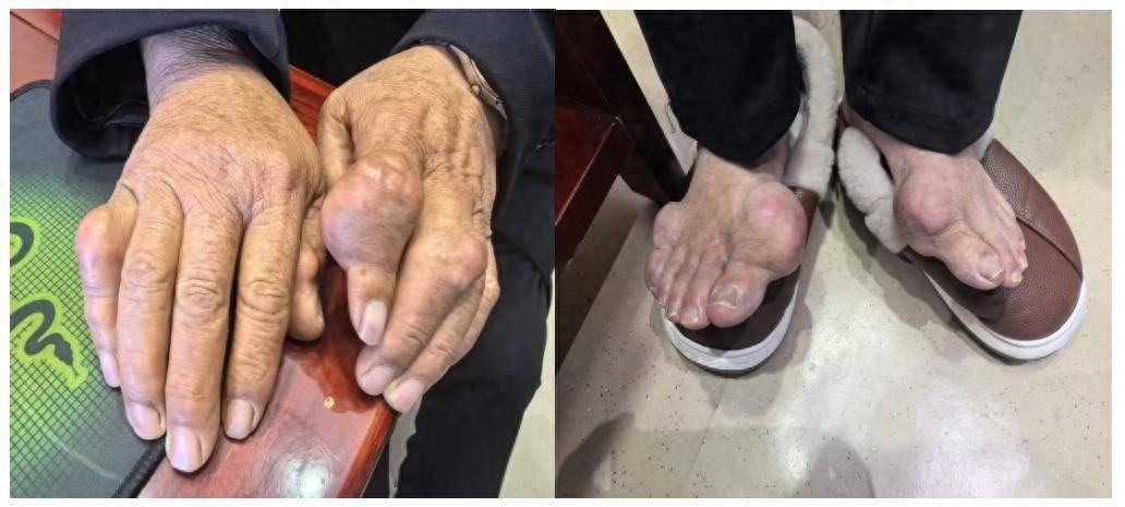 刘嗲嗲十余年前出现手足关节红肿胀痛,仅自行服用消炎镇痛药缓解,未进行系统治疗。近年来,手足出现无痛性结节且逐渐增大,严重影响生活后才就医。入院检查显示,其双足多发实性结节伴骨质破坏,符合痛风性关节炎及痛风石改变,尿酸高达589μmol/L(正常成年男性150~416μmol/L,女性89~357μmol/L)。经周细江主任、段超副主任医师问诊得知,刘嗲嗲长期大量进食高嘌呤食物,加上未规范诊治,最终形成痛风石。医疗团队为其制定了手术+中西医综合治疗方案,先进行消炎止痛、控制尿酸,再实施右足痛风石切除术,同时配合中药促进尿酸排泄,术后刘嗲嗲症状明显改善,尿酸水平趋于平稳。